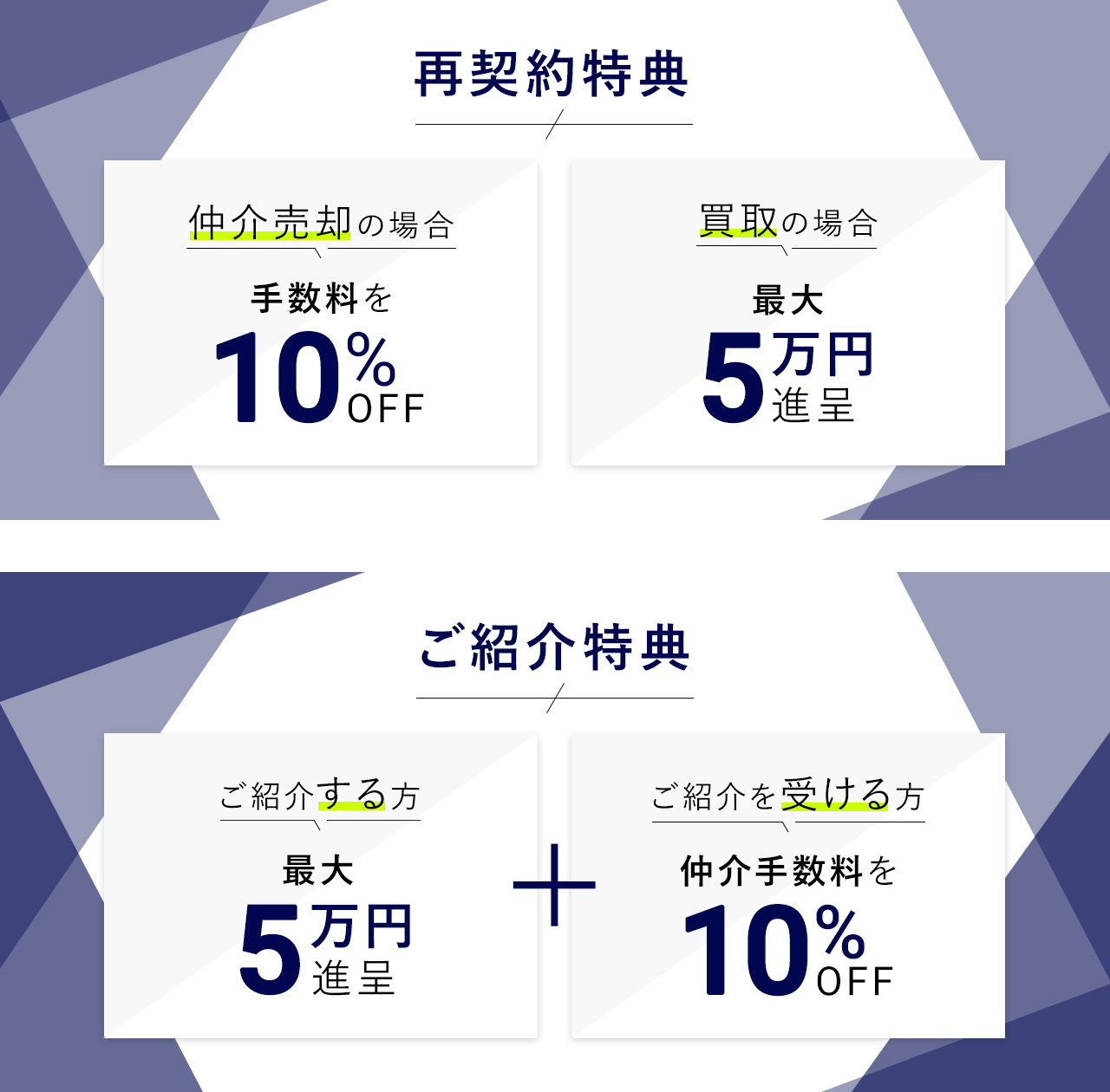 過去に当社の不動産売却にてご成約いただいた方で、別物件を仲介売却された場合は、仲介手数料を10%割引いたします。また、買取をご利用された際は最大5万円を進呈します。